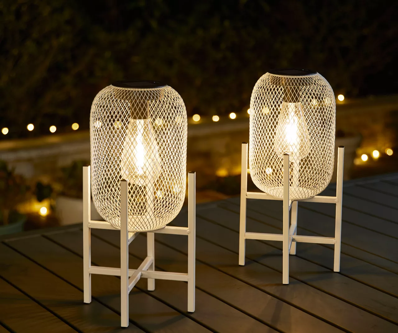 This classic solar lantern set features unique mesh designs that create intriguing graphic shadows, add artisan beauty and flickering drama to your outdoor space. The interior LED light in each lantern is shaped like a vintage Edison bulb that charges throughout the day to automatically turn on at night and off at dawn. Displayed on raised stands, this lantern set is a beautiful addition to a patio, deck or garden.