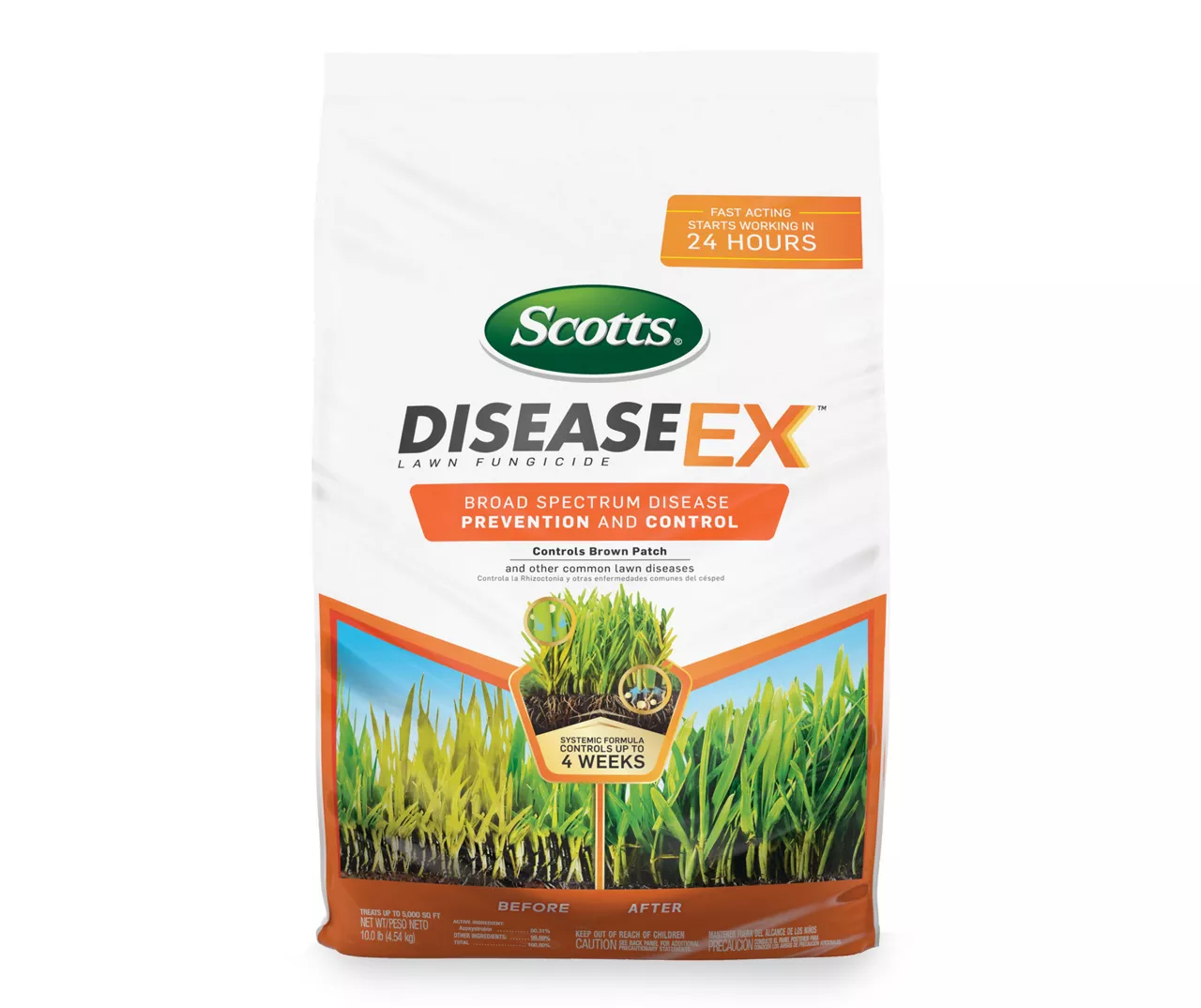 Prevent brown patch, red thread, powdery mildew and other common listed lawn diseases from getting in the way of a beautiful green yard with Scotts DiseaseEx Lawn Fungicide. It’s preventative when used on any lawn to stop diseases before they appear and curative when applied on established lawns showing signs of disease. Starts working within 24 hours of treatment and continues to control common broad spectrum diseases for up to 4 weeks.