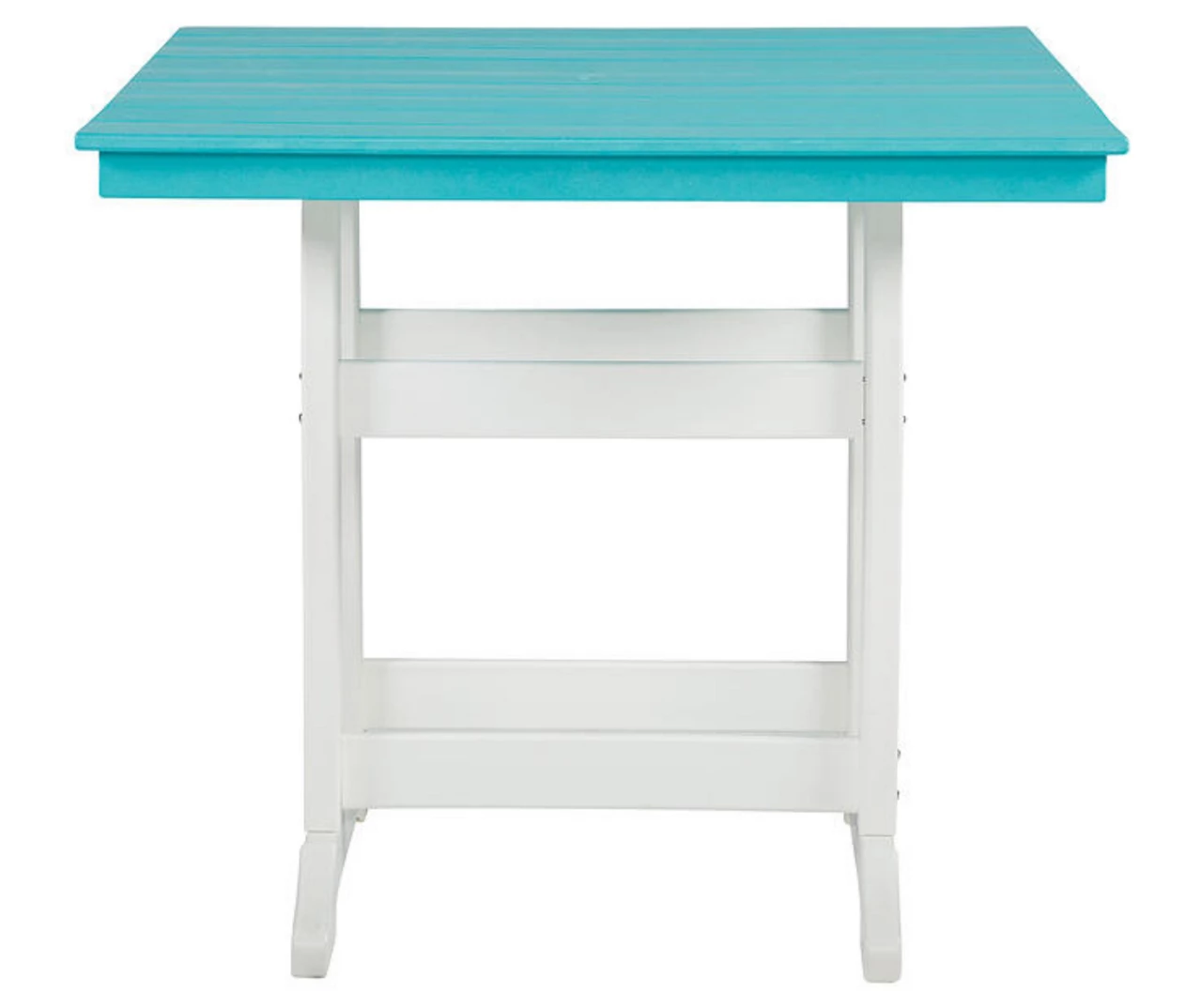Raise the bar on outdoor living with this dining table. Crafted for style and durability, it caters with a standout two-tone look that pairs a light turquoise and white for twice the interest. The table’s counter height design elevates the aesthetic. An umbrella hole lets you throw some shade on your outdoor living space.