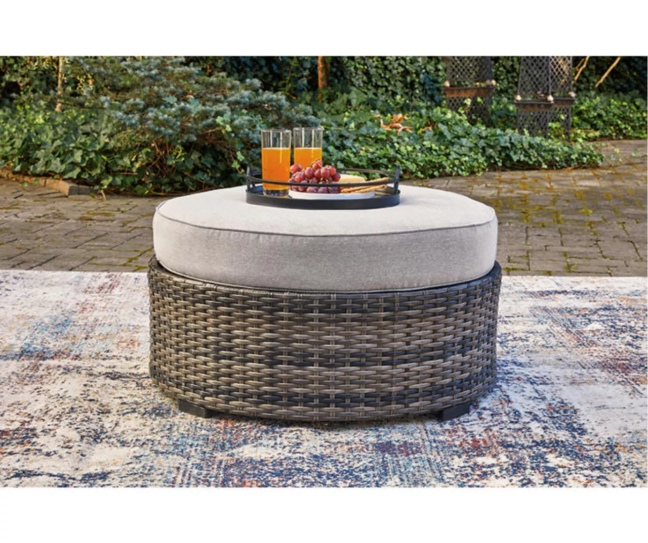 - Round outdoor ottoman with a cushioned top
