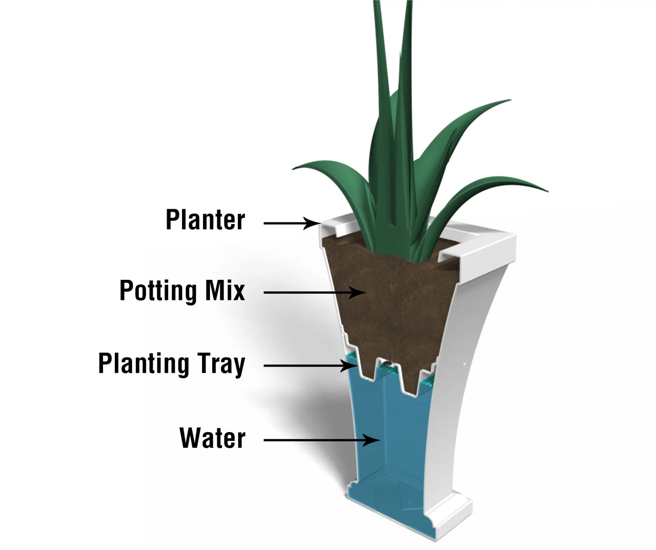 - Self watering tray insert creates sub-irrigation water system and encourages root growth
