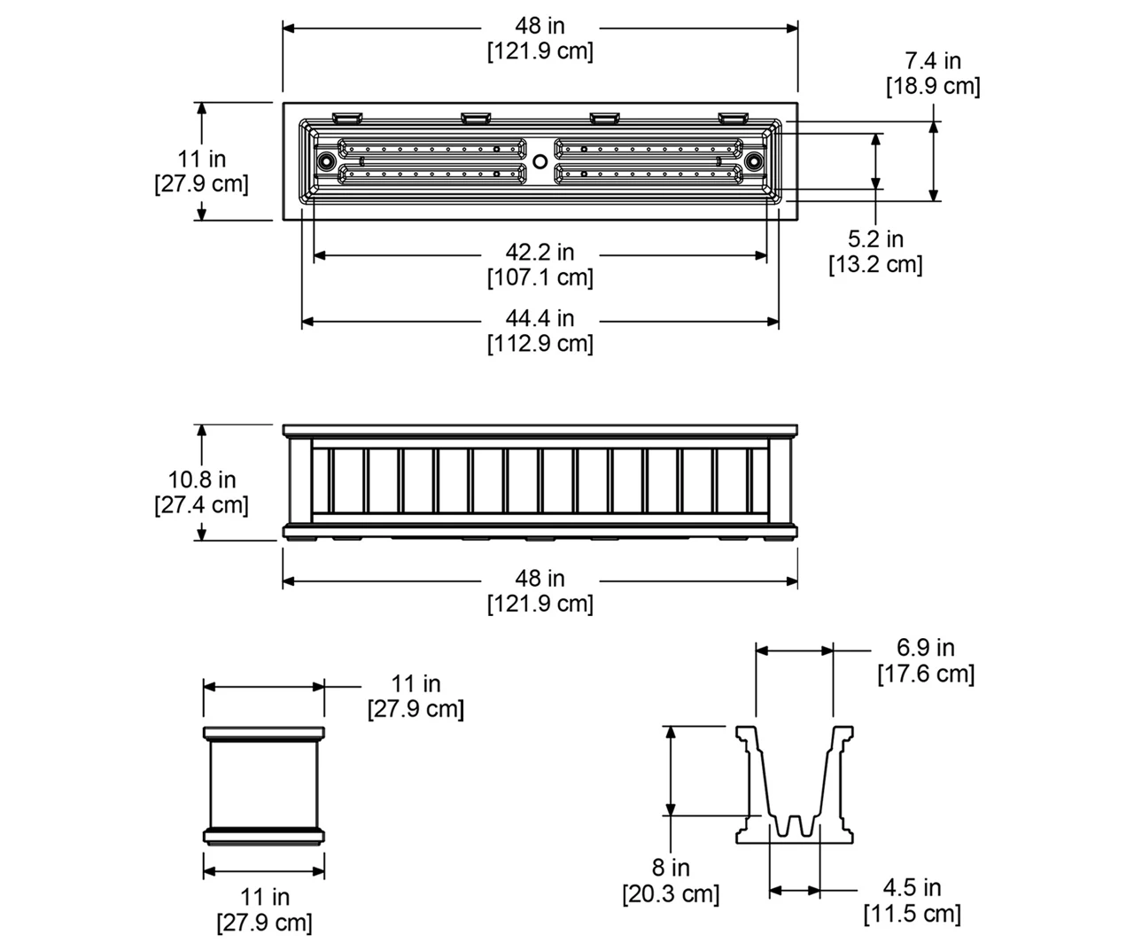 - Outside dimensions: 48″L x 11″W x 11″H
