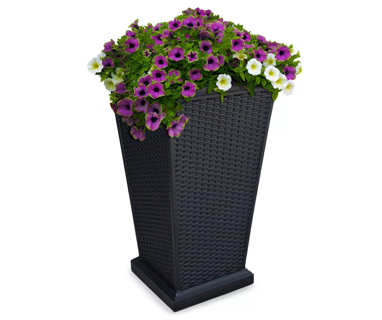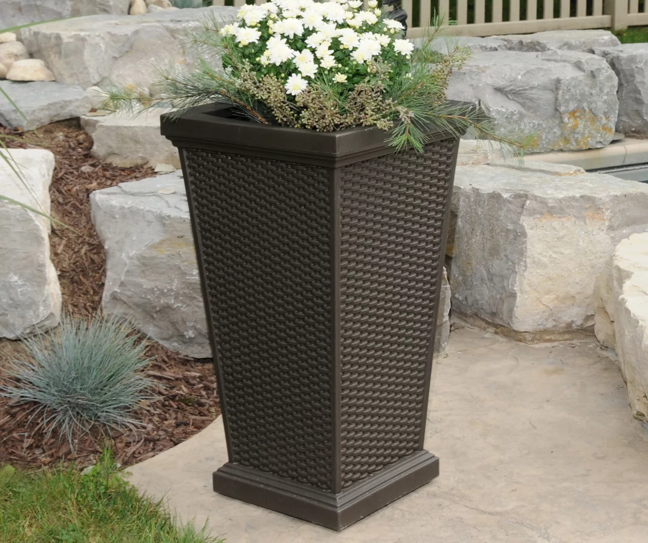 Add the look of wicker weaving without the risk of weather damage with this elegant Wellington white tall planter. Its charming design is perfect for the placement of seasonal flowers or plants. It will nicely adorn your porch, patio or deck for a touch of sophistication.