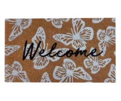 - “Welcome” message on the doormat with a butterfly pattern