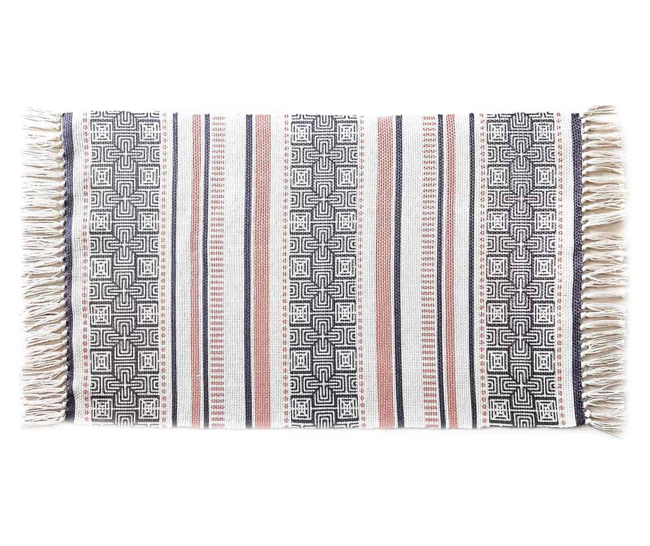 - Geometric stripe design on the rug with tassels on each end