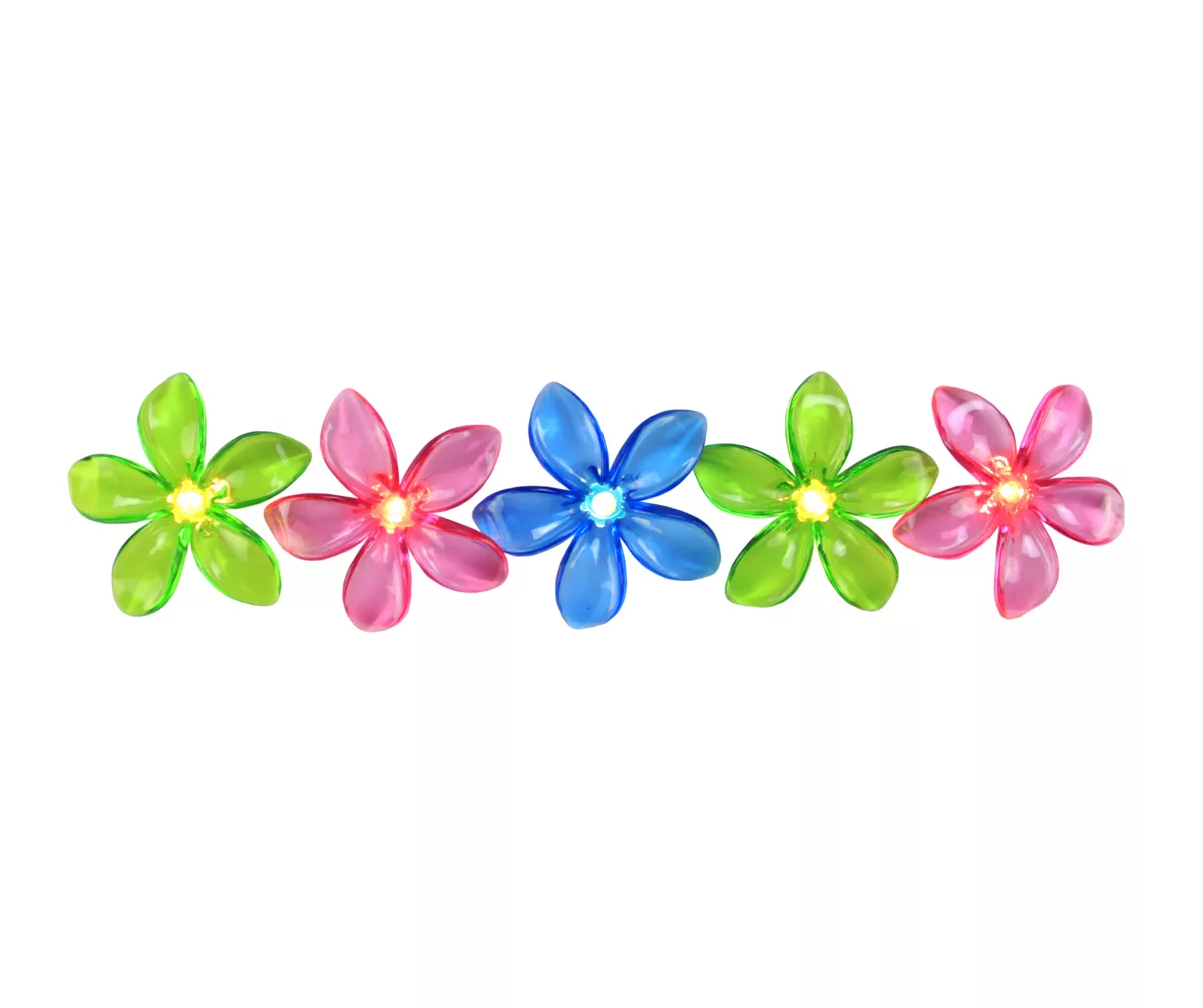 Illuminate your canopy, patio, indoor or any outdoor space with this strand of flower lights. This strand of clear mini lights has pink, blue and green flower-shaped shades. These lights will be the perfect addition to your spring or summer décor and parties.