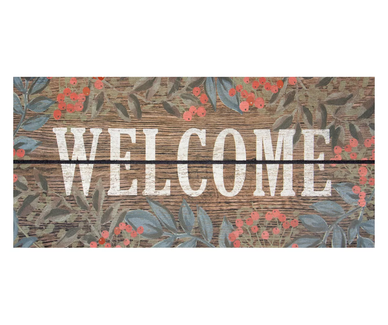 Designed to help trap dirt and debris for cleaner floors, this durable doormat is suitable for outdoor use and features a printed plank-style design with leaves, berries and a welcoming message that’s stain-resistant.
